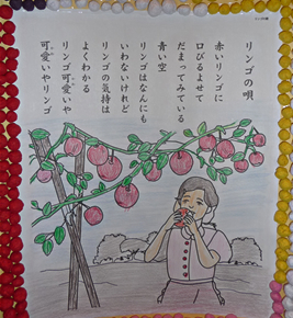 リンゴの赤色を何度も重ね塗りしたり、女の子のお顔にはうっすらとお化粧したりととっても丁寧に塗ってあります。コロコロは配色を考えながらも貼り付ける作業はとても素早くびっくりします。(オードリー管理人より)